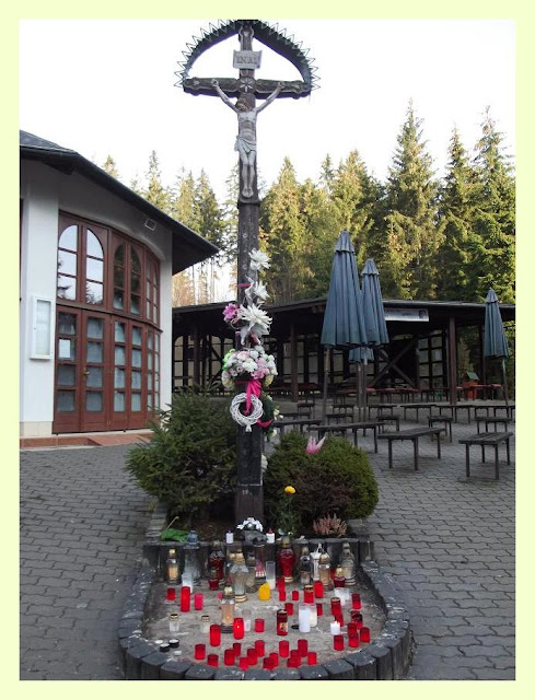 Potem stare stacje drogi krzyżowej, ja jednak skupiam się na modlitwie przy nowych stacjach. Pomiędzy nimi z boku, miejsce, gdzie w 1984 roku wędrowcy zobaczyli żywy obraz Matki Zbawiciela na świerku.