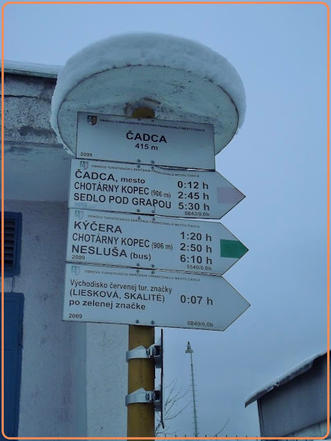 Słowackie Kysuce, po polsku zwane Kisuce i kolejna pętelka. Tak się ostatnio składa, że nasze trasy zaczynają się i kończą w tym samym miejscu. Ma to na pewno swoje uroki i pewnie wygodne jest dla samochodziarzy, ale my tradycyjnie do Czadcy przyjechaliśmy pociągiem i o 8.16 rozpoczynamy wędrówkę tradycyjnym kwartetem, szlakiem czerwonym. Dziś nie ma ciekawszej prognozy pogody niż ta, że będzie całkowite zachmurzone, a z góry prószył będzie śnieżek. Tak będzie... i relacja będzie w odcieniach popielu, szarości i czasem coś z innych kolorów pokaże się.