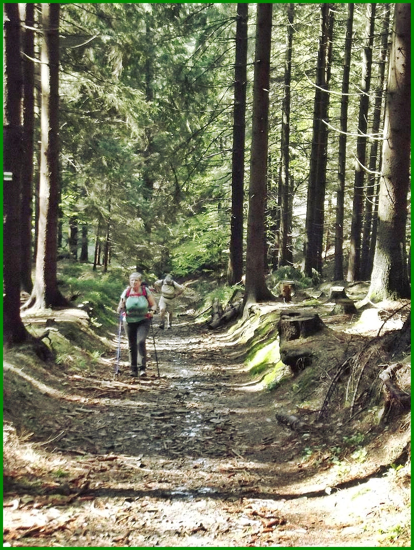 Z proporczykiem akcji i nalepkami na plecakach pojechaliśmy do Morawki, konkretnie do miejsca zwanego Úspolka, gdzie o 9.10 weszliśmy na zielony szlak wiodący na Slawicz. Sporo asfaltu, ale on po czasie zniknie. Hrachové mijamy o 9.28. Tam właśnie odbija w prawo od nas czerwony szlak też na Slawicz, ale on jest kilka razy dłuższy niż ten nasz, którym dziś idziemy.